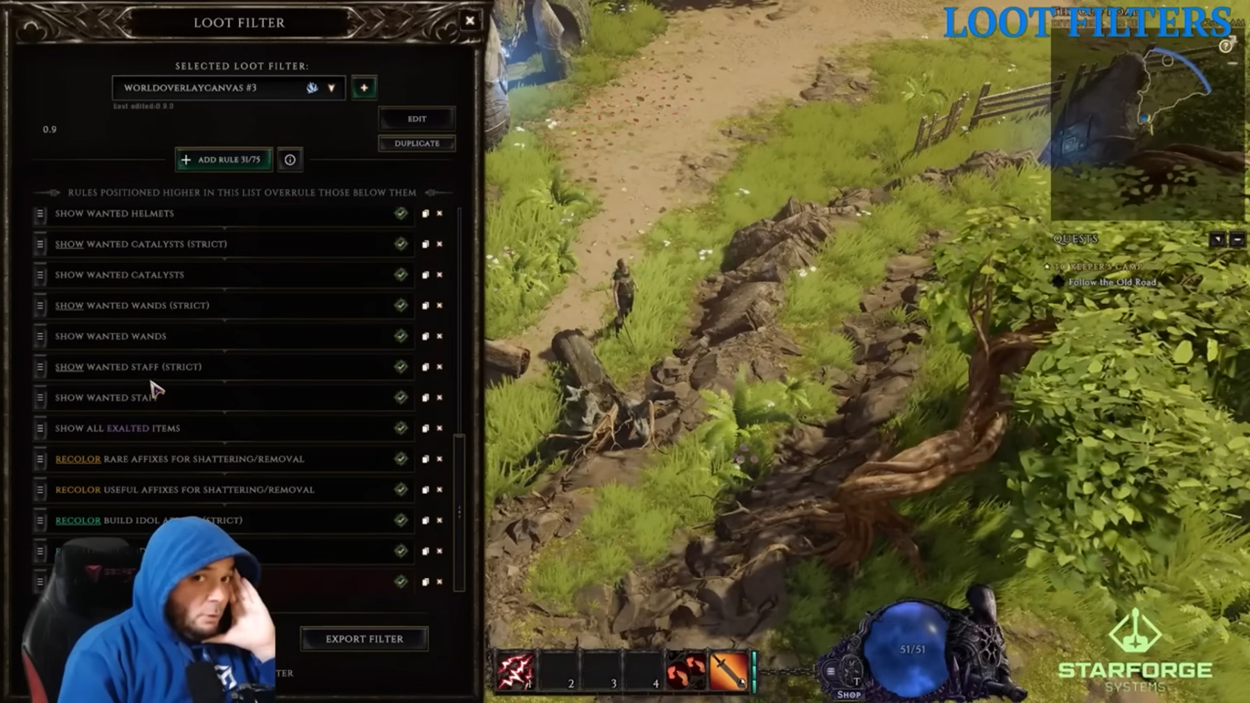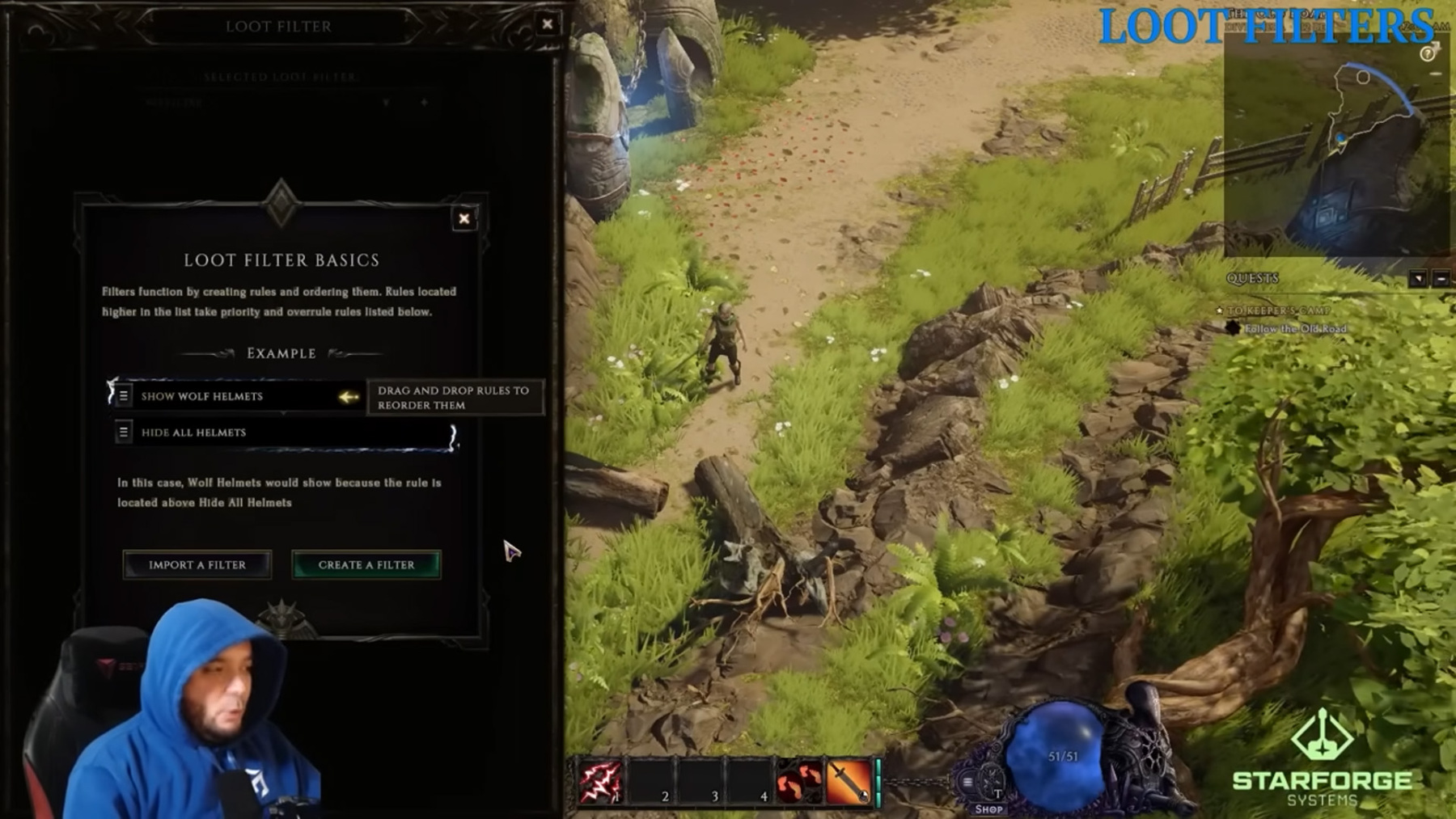 A konfiguráció során megadhatjuk a nevét, a leírását és adhatunk hozzá egy ikont is. A szűrő egy hierarchikus kulcsot követ, vagyis a szűrűben létrehozott szabályok közül a legfelső felülírja az alatta lévőket. Szabályokat az „Add Rules” gombbal lehet létrehozni és itt lehet beállítani, hogy például milyen tárgyakat rejtsen el a játék a loot során (például: elrejthetjük a normal, a magic vagy a rare itemeket, de ezt a szabályt majd alulra kell húzni, hogy a felette lévők felülírhassák bizonyos esetekben). Itt lehet beállítani azt is, hogy milyen színnel jelenjenek meg egyes item-típusok, amikor kiesnek. A szabályok létrehozása után egy jelölőnégyzetben lehet ki-be kapcsolni azokat.