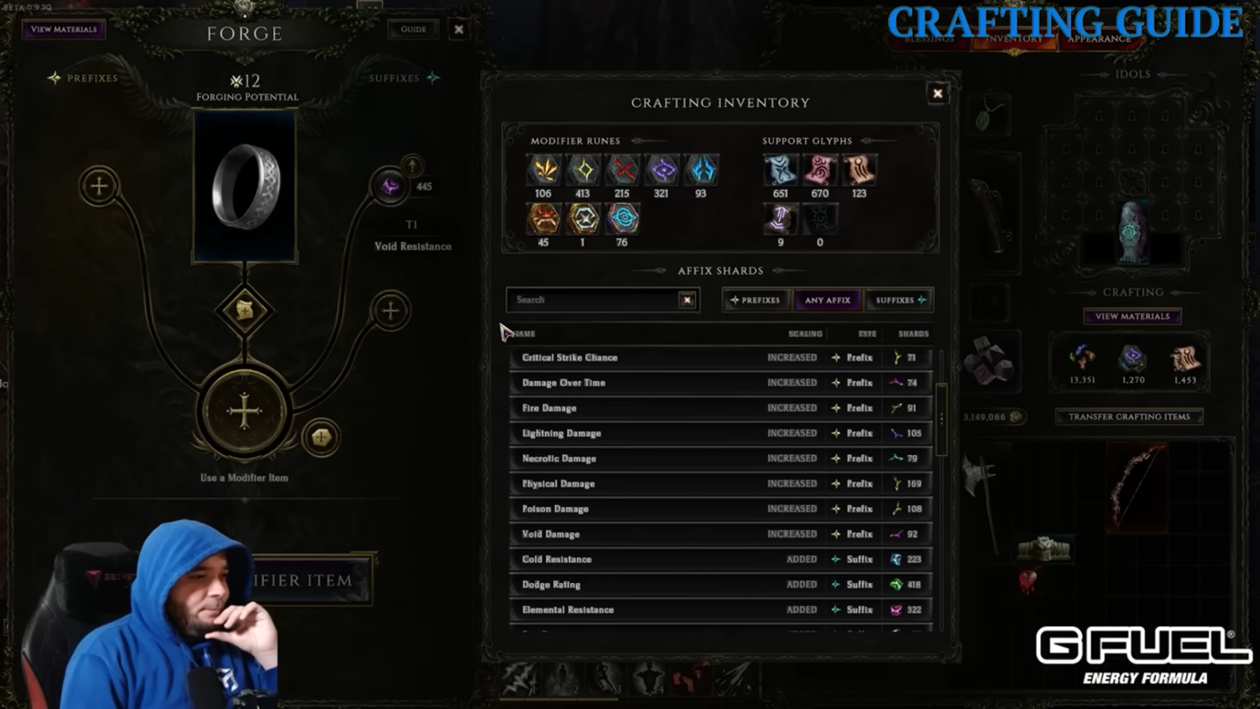 Ha beteszünk a központi slotba egy olyan Itemet, amelyen pl. egyetlen suffix van csak, azt itt jobbá lehet tenni. Fontos stat a „Forging potential”. Ez a szám a craftolási lehetőségek számát jelöli és minden egyes Forge-művelet beleszámít, vagyis minden amit itt csinálsz, az felemészti ezt a statot. Ha ez a szám eléri a nullát, akkor nem lehet a tárggyal tovább mesterkedni, vagyis arra kell törekedni, hogy vagy már eleve jó affixek legyenek a tárgyadon vagy sok potenciállal rendelkezzen. A „+” jelre kattintva (pl. a suffix oldalon) feljön egy ablak és abban egy lista, amely a tárgyra pluszban felrakható suffixeket tartalmazza.