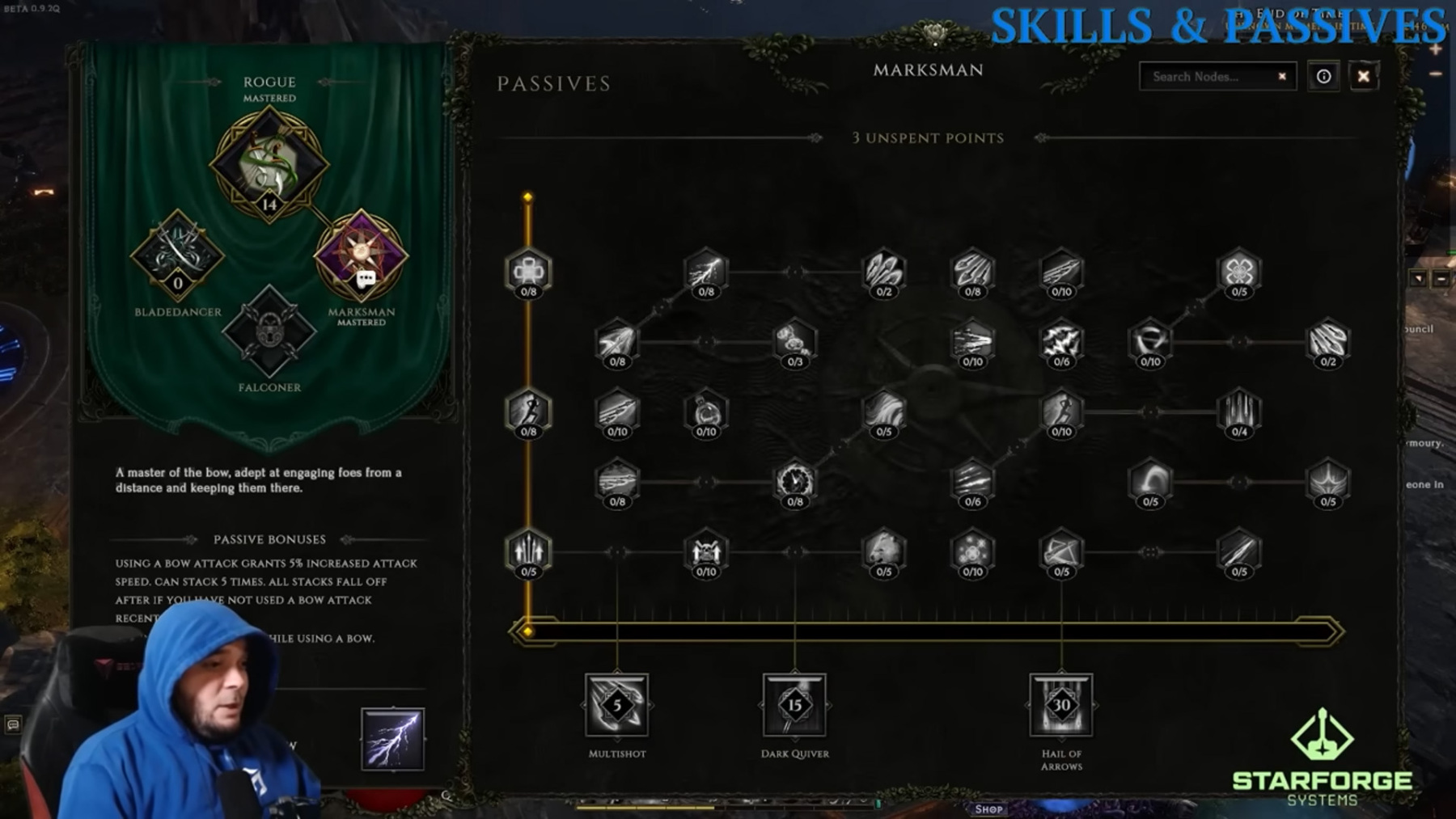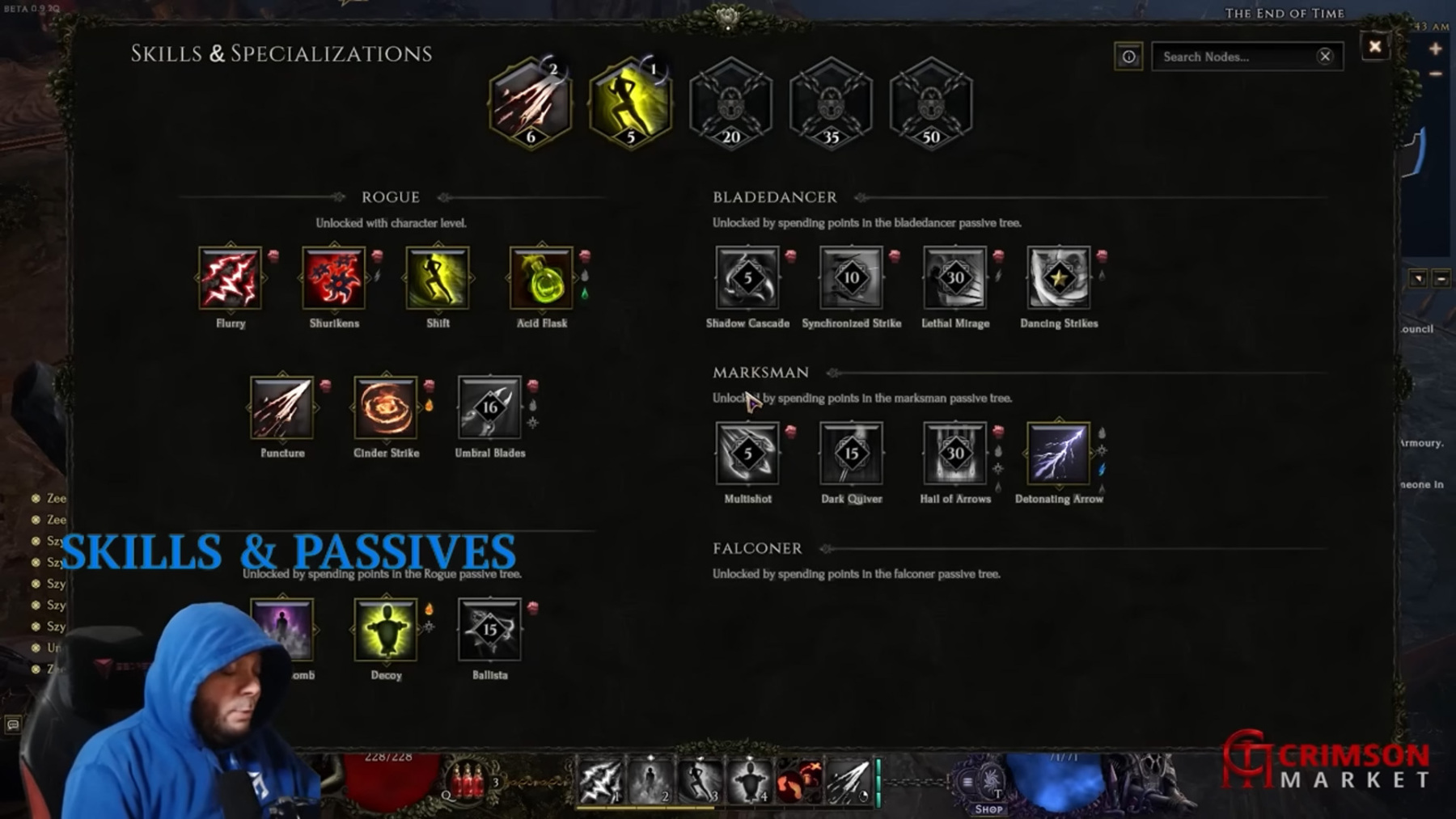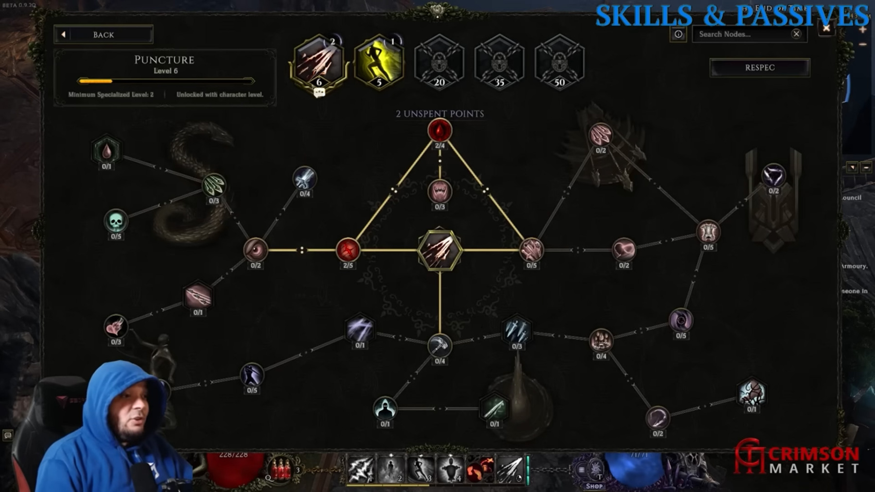 A Skillfát az „S” gomb megnyomásával hozhatod elő. Az előugró ablak három részből áll: a base karakter skilljei a karakter fejlődésével lesznek elérhetők, a második részben látható skilleket a main passive tree (a base karakter passzív fája) pontjaiból lehet feloldani, míg a harmadik rész skilljeit a mastery karakterosztály kiválasztása után létrejövő mastery passive tree pontjaiból lehet feloldani. Minden egyes skillhez, amely a „Skills &Specialization” ablakban van, tartozik egy teljes skillfa!