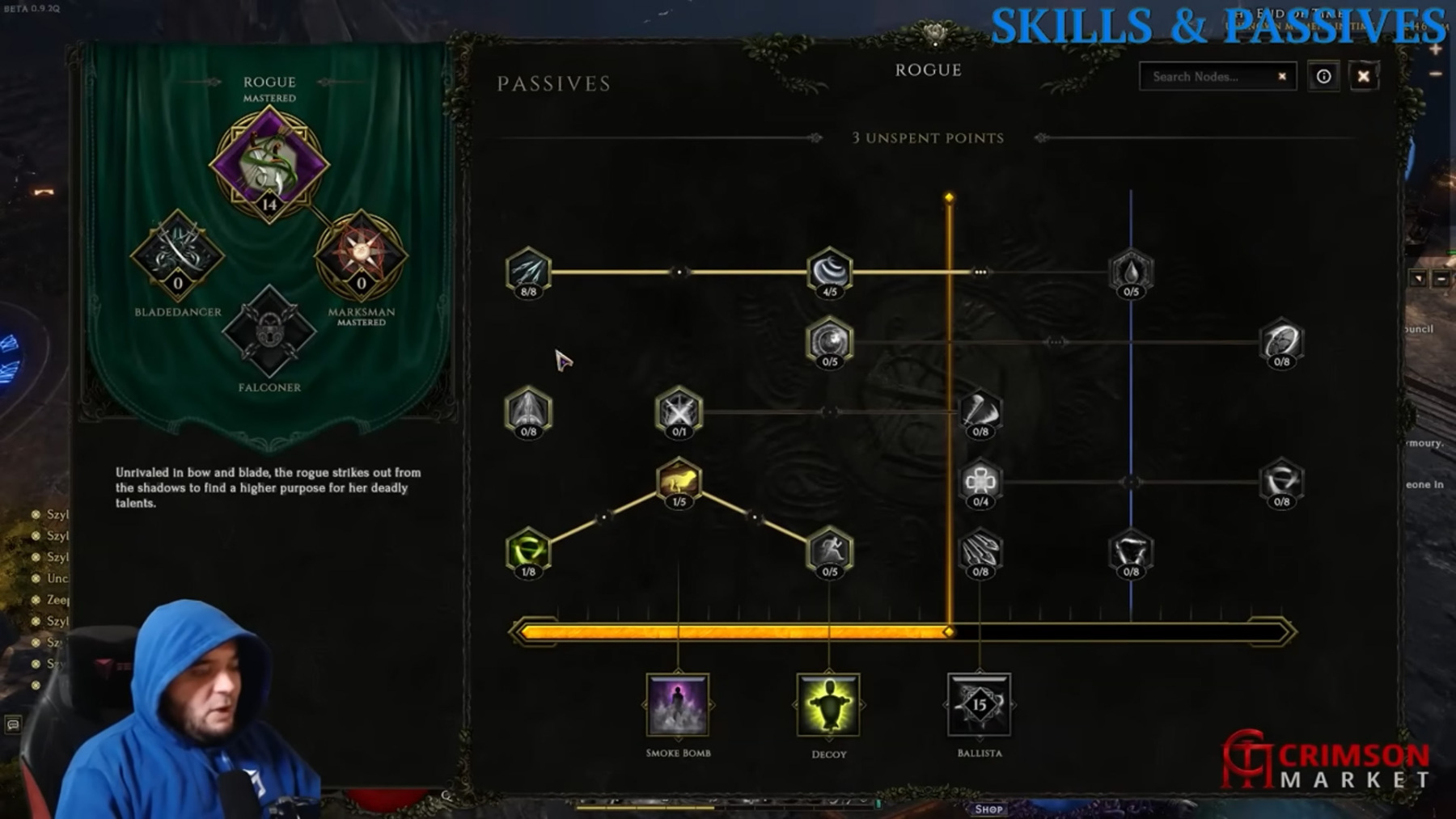 Ha megnyomod a „P” gombot, a „Passives” ablak ugrik elő és ez is több részből áll: bal oldalt ki tudod választani, hogy melyik passzív fán költöd a pontokat, illetve a jobb oldali részen pedig magukat a passzív tulajdonságokat tudod kiválasztani.