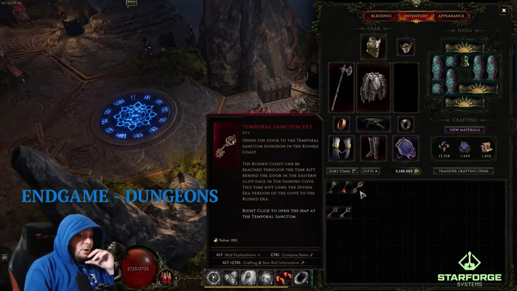 Az első dungeon a „Lightless Arbor”, ebben a legvégén aranyat költhetsz hatalmas jutalmakért. A második a „Soulfire Bastion”, amelynek a végén van egy Gambler, aki különleges tárgyakat tud adni neked igazán jó affixekkel. A harmadik a „Temporal Sanctum”, ahol létre tudod hozni a legendás tárgyaidat (a cikk elején említett unique-exalted összeolvasztás ebben a Dungeonban lehetséges). Minden Dungeonnak más a nehézsége, minél nagyobb a nehézség, annál nagyobb a jutalom. A kulcs használata: jobbklikk a kulcson, majd a térkép jelölni fogja, hol kell beadni a kulcsot és a leadás után már mehetsz is.