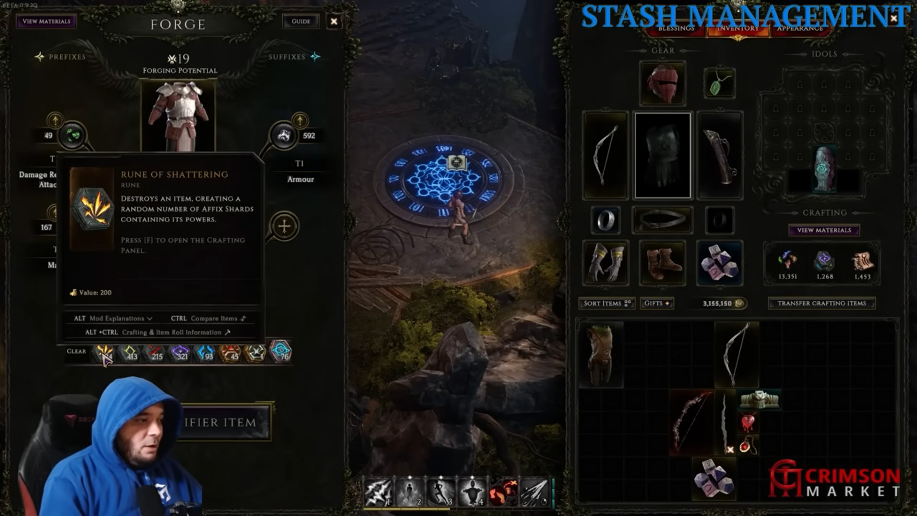 A rúnákat a hatszög alakú „+” jelre kattintva éred el. Ezekből is többféle létezik és szintén mindegyikhez van tooltip. A „Rune of Shattering” a tárgy széttörésére szolgál, ennek használatával a tárgy megsemmisül, de az affixokhoz tartozó Shardok visszakerülnek a bankba, azzal a megkötéssel, hogy az affixok tárgyon lévő szintje és a nulla szint közötti értéknek megfelelő shard mennyiséget kapod csak vissza. Összefoglalva: a széttörő rúna nagyszerű eszköz arra, hogy elkezdd felépíteni a Shard-készleted.