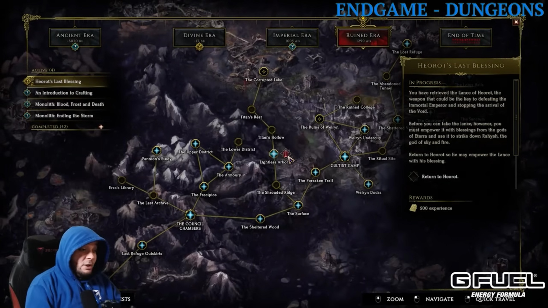 Az első dungeon a „Lightless Arbor”, ebben a legvégén aranyat költhetsz hatalmas jutalmakért. A második a „Soulfire Bastion”, amelynek a végén van egy Gambler, aki különleges tárgyakat tud adni neked igazán jó affixekkel. A harmadik a „Temporal Sanctum”, ahol létre tudod hozni a legendás tárgyaidat (a cikk elején említett unique-exalted összeolvasztás ebben a Dungeonban lehetséges). Minden Dungeonnak más a nehézsége, minél nagyobb a nehézség, annál nagyobb a jutalom. A kulcs használata: jobbklikk a kulcson, majd a térkép jelölni fogja, hol kell beadni a kulcsot és a leadás után már mehetsz is.