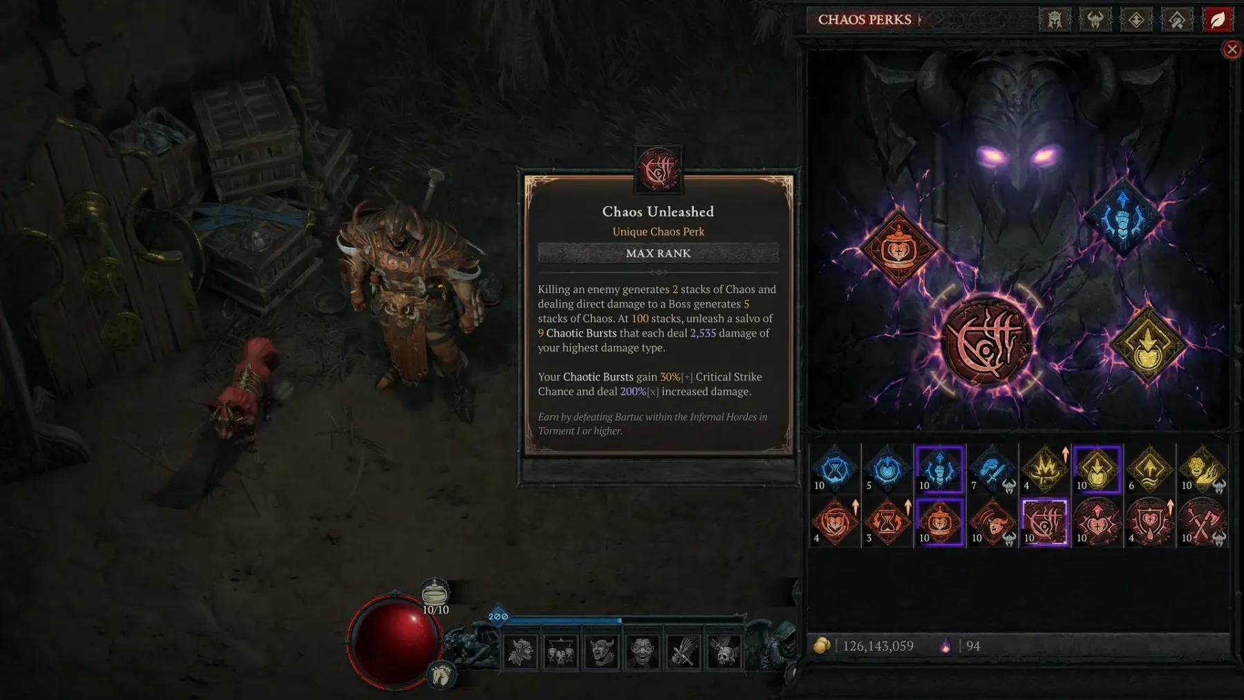 A Season 10 témájának másik pillére, a káosz páncél (Chaos Armor) a játék számos forrásából megszerezhető. Bartuc kiváló forrása ennek a felszerelésnek a Torment szinteken, garantált loot eséllyel Torment III és IV szinteken.