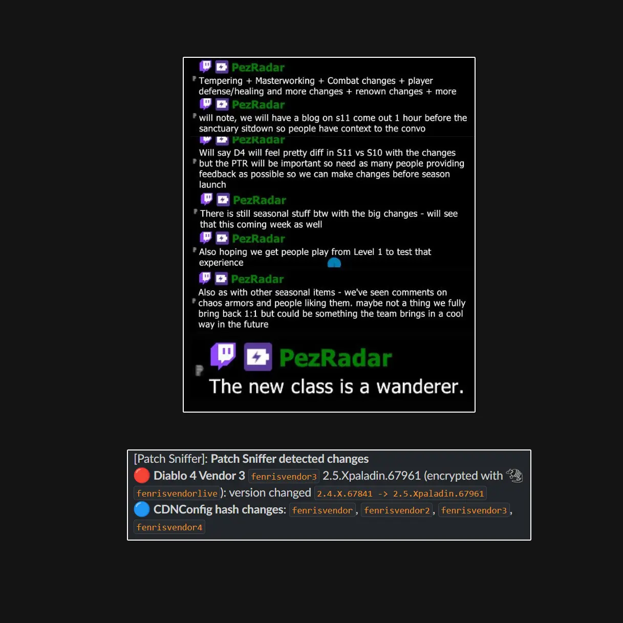 - Wanderer karakterosztály: Bár Fletcher nagyon ironikusan utalt arra, hogy az új osztály „vándor” lesz, ez a kifejezés a játékban a játékos karakterét írja le. De még ez a vicces megjegyzés is sok információt tartalmaz. Augusztusban több forrás is felfedezte, hogy a titkosított 2.5-ös patch gyanús módon tartalmazta a „Paladin” nevet. Ekkor még nem volt világos, hogy a 2.5 egy újabb szezon vagy egy kiegészítő patch lesz-e. Lehetséges, hogy a 11. szezon egy átalakítások szezonja lesz, és egy új osztályt is tartalmaz, mielőtt 2026-ban megjelenik a kiegészítő.