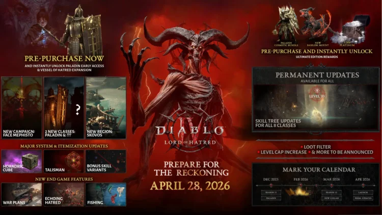 A kiegészítőt már most előrendelheted és korai hozzáférésben azonnal játszhatóvá válik a Paladin karakterosztály, hogy aztán egy újabb osztály váljon elérhetővé a 2026. április 28-i megjelenéskor, a Diablo IV további jelentős frissítéseivel együtt.