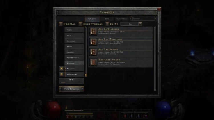 A Krónika (Chronicle) egy áttekinthető módszert kínál az összegyűjtött tárgyak nyomon követésére, segítve téged a végső kincsek felhalmozásában és megőrzésében. Gyűjtsd, rögzítsd és tökéletesítsd a fegyvertárad, miközben a Diablo II legritkább és legkívánatosabb jutalmait keresed.