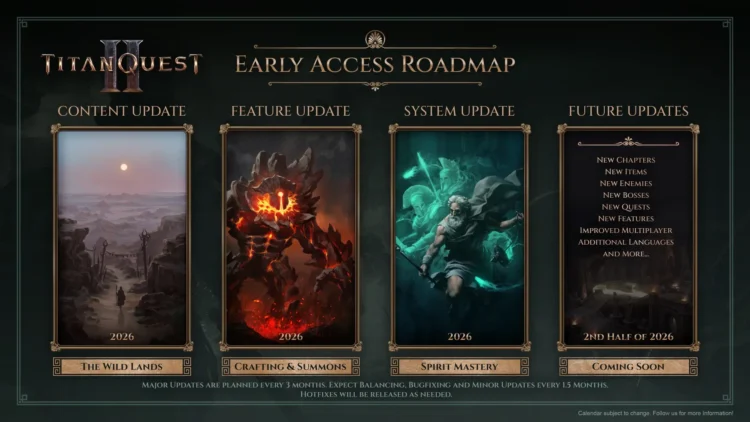 A fenti grafika még a szövegnél is beszédesebb talán: 2026-ban se vesznek vissza és ugyanolyan tempóban frissítik a Titan Quest II-t, mint eddig. Az év első felében három komoly tartalmi elem kerül a játékba: egy új zóna, a Wild Lands, a Crafting és a Summoning funkciók és a Spirit Mastery. Aztán az év második feléban jönnek az újabb fejezetek, az újabb ellenfelek, az újabb küldetések és a fejlesztett multiplayer mód.
